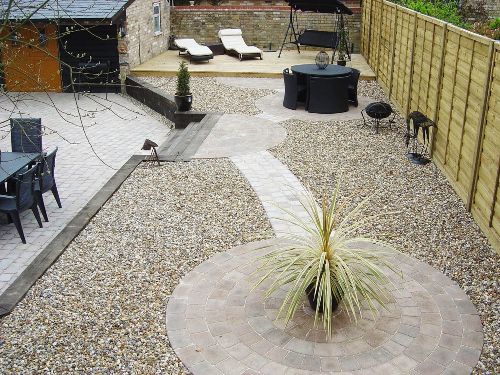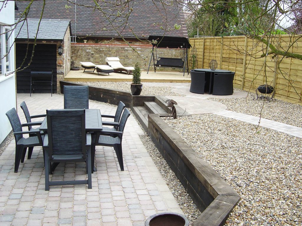 The project included constructing a frame for a raised decked area, building a sleeper retainer wall stepping up to a timber laid deck seating area and low maintenance gravelled garden, including decorative paved circles for additional seating and hot tub (not in picture).